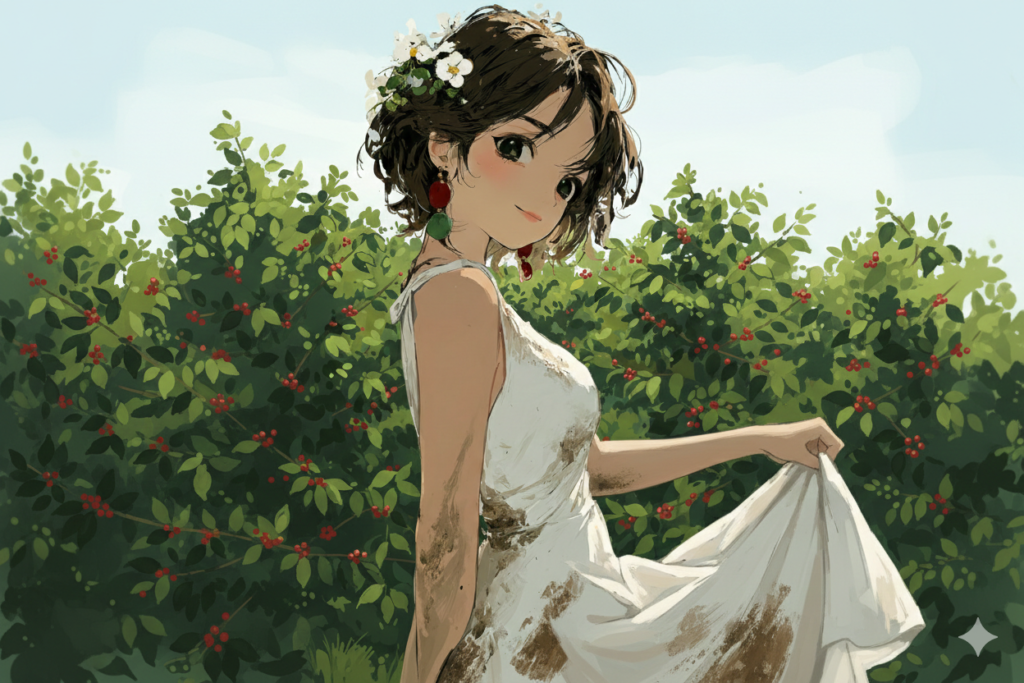 身にまとう服は布切れ一枚で出来たワンピース、国旗を模した赤と緑のイヤリング、頭にはジャスミンの髪飾り。